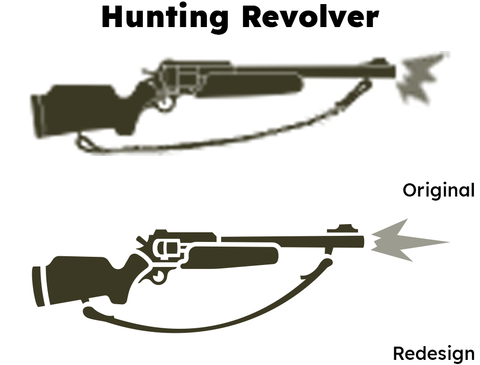 This redesign of the Hunting Revolver icon simplified the shape, deepening the lines around key elements of the gun's profile (like the revolving chamber and foregrip) and getting rid of smaller details. This sort of "hierarchy" of detail is important in making these icons feel like the weapons they represent.