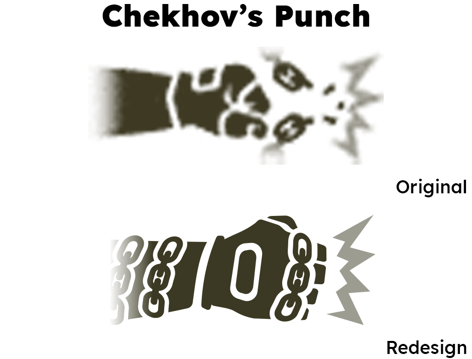 In-game, Chekhov's Punch are chains wrapped around the character's fists. The original icon (created by me when the weapon was introduced in 2022) could not convey this visually at 32x resolution, but vectors made this possible.