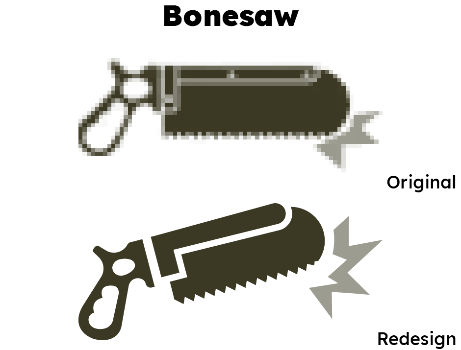 A problem I identified with older combat feed icons is that some longer weapons would appear very large, in a way that seemed at odds with how weak they were. (Since sprite icons were all 32px in height, horizontally longer icons would appear large.) Angling the weapon, like I did here with the Bonesaw, helped give it a shorter, less salient profile, and look more dynamic.