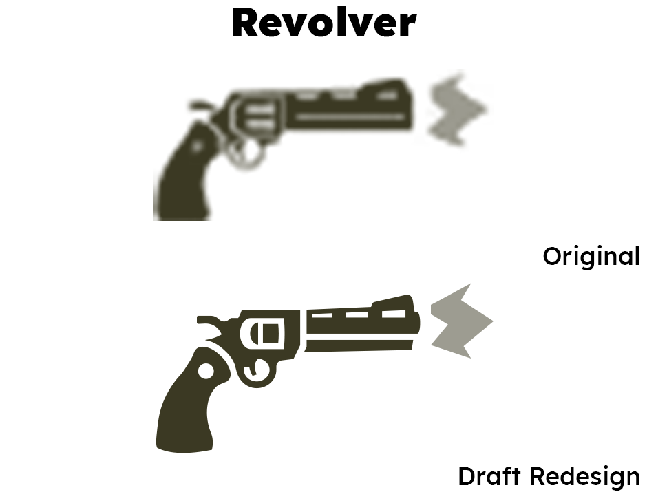 The original revolver icon uses half-transparency on the weapon's body, e.g. the circle at the top of the grip, which is something I wanted to avoid outside of the muzzle flash. These icons are meant to resemble the pictographs on road signs and hazard warnings, which tend to only be one color.